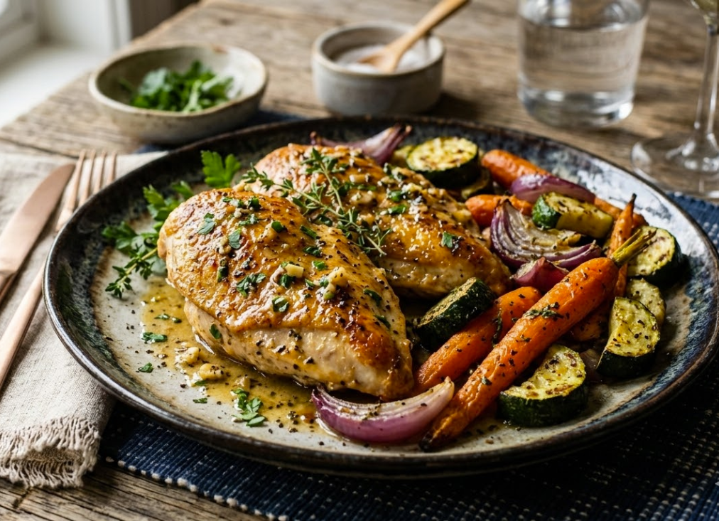 One of the best things about this recipe is that it uses common ingredients that are easy to find. The combination of garlic, butter, and herbs gives the chicken a rich flavor that pairs beautifully with roasted vegetables.